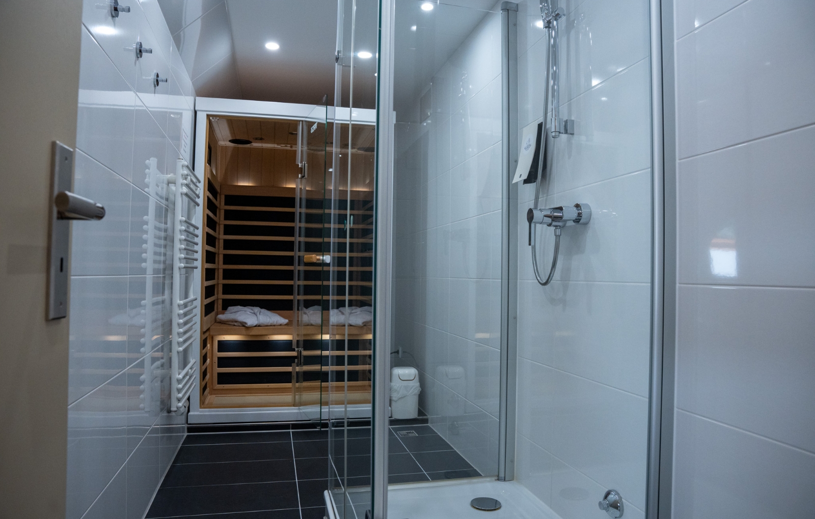 Oben: Badezimmer mit Dusche und Infrarotkabine
